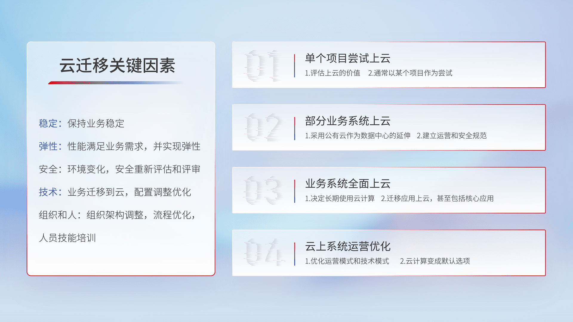 结合实际业务,,,,从规划设计、、、、云平台选型、、、云原生改造、、、数据迁移、、、集成交付,,,迁移全过程为客户识别最佳上云路径,,,做好风险识别管理,,设计网络架构、、、身份权限、、安全审计合规、、操作审计、、日志审计、、监控告警策略、、、多站点容灾设计等,,,对云上基础设施进行整体规划,,提升IT治理水平,,,,以满足弹性、、、高可用、、、高性能的需求。。。