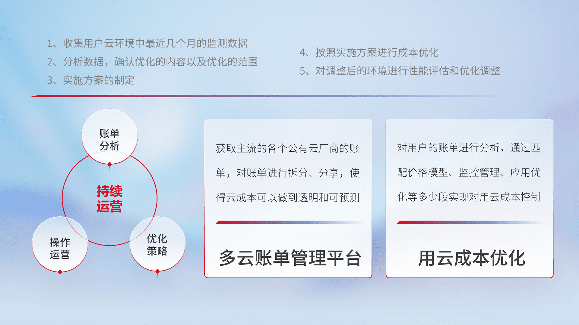 通过多云纳管,,,,以统一的资源数据模型把客户的云资源进行抽象和封装,,,进而实现对多云资源的统一操作,,保障云资源管理的可靠性、、稳定性与可用性。。。量身定制化运维内容,,,配置、、开发运维、、、、补丁管理、、、备份、、监控、、认证和访问管理、、、、审计和日常巡检等,,,保障在用云过程中的可靠度,,稳定度以及高可用率。。。。